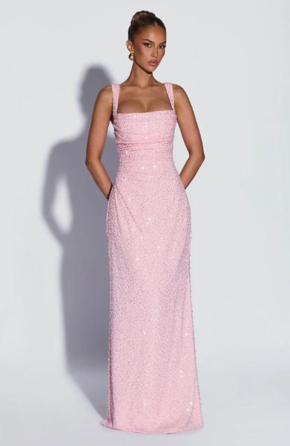 Fason wyróżnia się gorsetową konstrukcją, subtelnymi marszczeniami oraz eleganckim dekoltem typu square neckline. Całość uzupełnia wiązanie na plecach, które pozwala idealnie dopasować sukienkę do figury, tworząc luksusowy i dopracowany efekt.