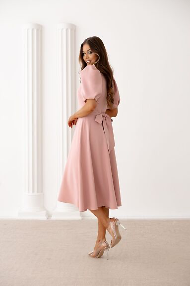 Sukienka midi to elegancka i kobieca propozycja idealna na wesela, przyjęcia i wyjątkowe okazje. Fason posiada delikatne bufki na rękawkach, subtelny malutki dekolt i wiązanie z tyłu na kokardę, które dodaje sukience uroku i podkreśla talię.
