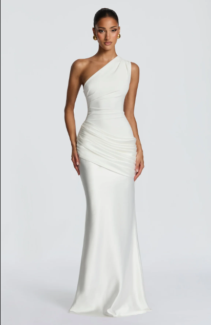 Fason wyróżnia się asymetrycznym krojem na jedno ramię, delikatnymi marszczeniami oraz obniżoną talią, która pięknie modeluje sylwetkę. Góra wykonana z dopasowanego materiału kontrastuje z lekko układającym się dołem, nadając całości elegancji i płynności ruchu.
