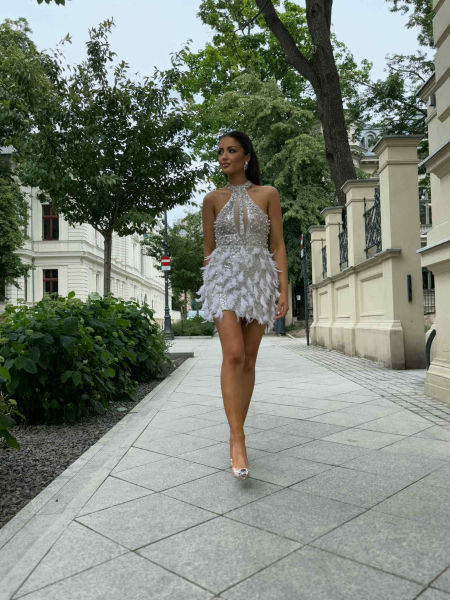 Odkryj elegancję z naszą suknią wieczorową Sequin w kolorze bezowo-białym. Dopasowany fason podkreśla kształty, a dekolt w kształcie litery V zdobiony kryształami dodaje szyku. Bogate zdobienia z piórkami oraz kamieniami zapewniają wyjątkowy efekt, a materiał zapewnia wygodę i swobodę ruchów. Idealna na eleganckie imprezy, takie jak wesele, studniówka czy sylwester – poczujesz się jak królowa na każdym balu.